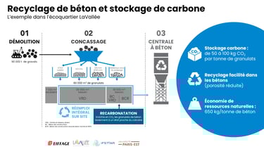 Mise en valeur d’une expérimentation chantier complexe, du concassage au réemploi et au stockage carbone, afin d’en faire la pédagogie, d’objectiver les gains, cadrer les conditions de réussite et faciliter la réplication à grande échelle.