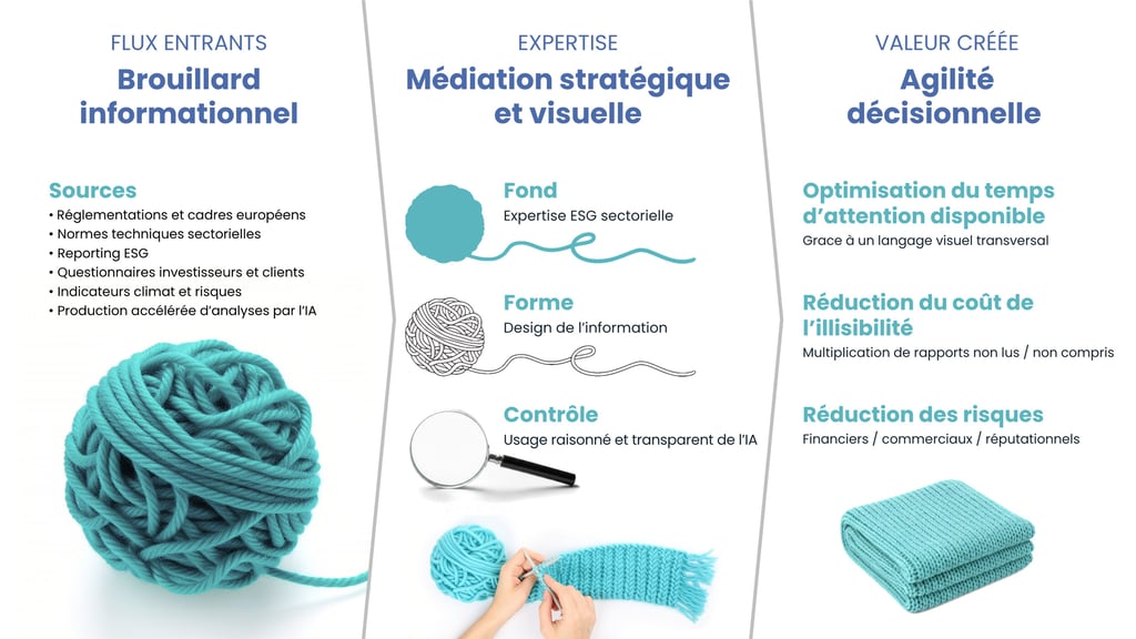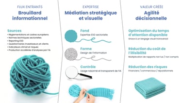 ECOSTATERA transforme le brouillard informationnel ESG en décisions claires et partagées. À la différence d’une agence de création centrée sur l’esthétique, d’une agence de datavisualisation focalisée sur la restitution de données ou d’outils d’IA générative produisant des supports automatisés, nous intervenons à l’interface du fond et de la forme.